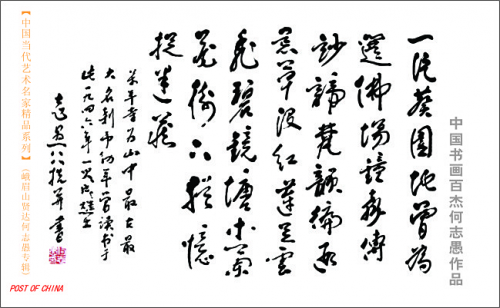 何志愚,誉为“峨眉山三老”,“峨眉山画派”创始人之一。佛学家、书画家、诗人。1918年生于峨眉桂花桥一油漆、雕刻工艺世家,于2011年8月 在峨眉逝世。1932年14岁时上峨眉山出家,1935年冬在成都文殊院受戒,法名妙伦,1949年解放后还俗。曾任乐山市佛教协会秘书长,受教于能学、普学、印诠、昌圆法师,王恩洋、张英学、李天祯、伍瑞图等名家。聚佛学、诗、书、画、乐、史于一身,成为和尚学者,喻为峨眉山活字典。出版了《佛教圣地峨眉山》、《峨眉山寺庙匾联诠释》、《中国当代艺术名家精品系列(峨眉山贤达专辑)——中国书画百杰何志愚作品》、《峨眉山三老诗书画集》,参与编撰了《峨眉山佛教志》、《峨眉山志》、《峨眉文史》等著作。请郭沬若题书《天下名山》 ,曾向朱德、胡耀邦、刘文辉、熊克武、付抱石、刘雨耕等国家领导、友人、文化名人介绍峨眉山两百多次。晚年义务课徒,传授书法艺术和佛学理论,助人为乐,常以诗书画惠人。