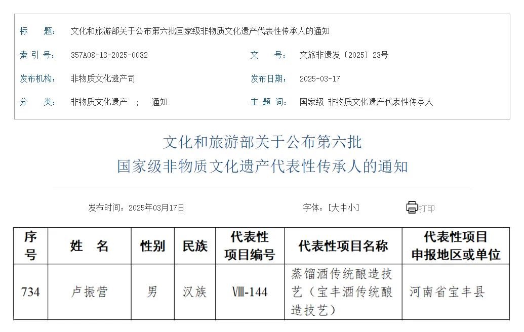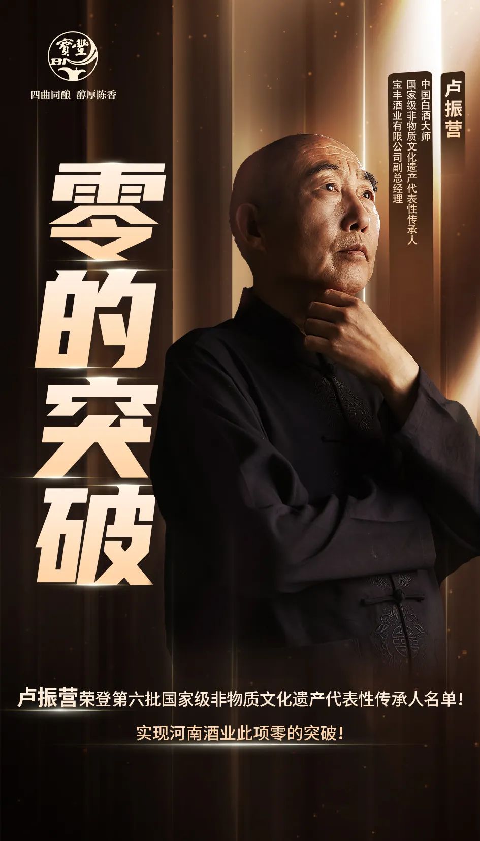 3月17日,文化和旅游部公布第六批国家级非物质文化遗产代表性传承人名单,全国共有942人获此殊荣,卢振营荣耀上榜。作为中国白酒大师、宝丰酒业有限公司副总经理,卢振营主要负责宝丰酒业生产酿造及工艺创新发展传承。此次上榜使他成为河南酒业中首位获得国家级非物质文化遗产代表性传承人的荣耀代表,实现河南酒业零的突破。